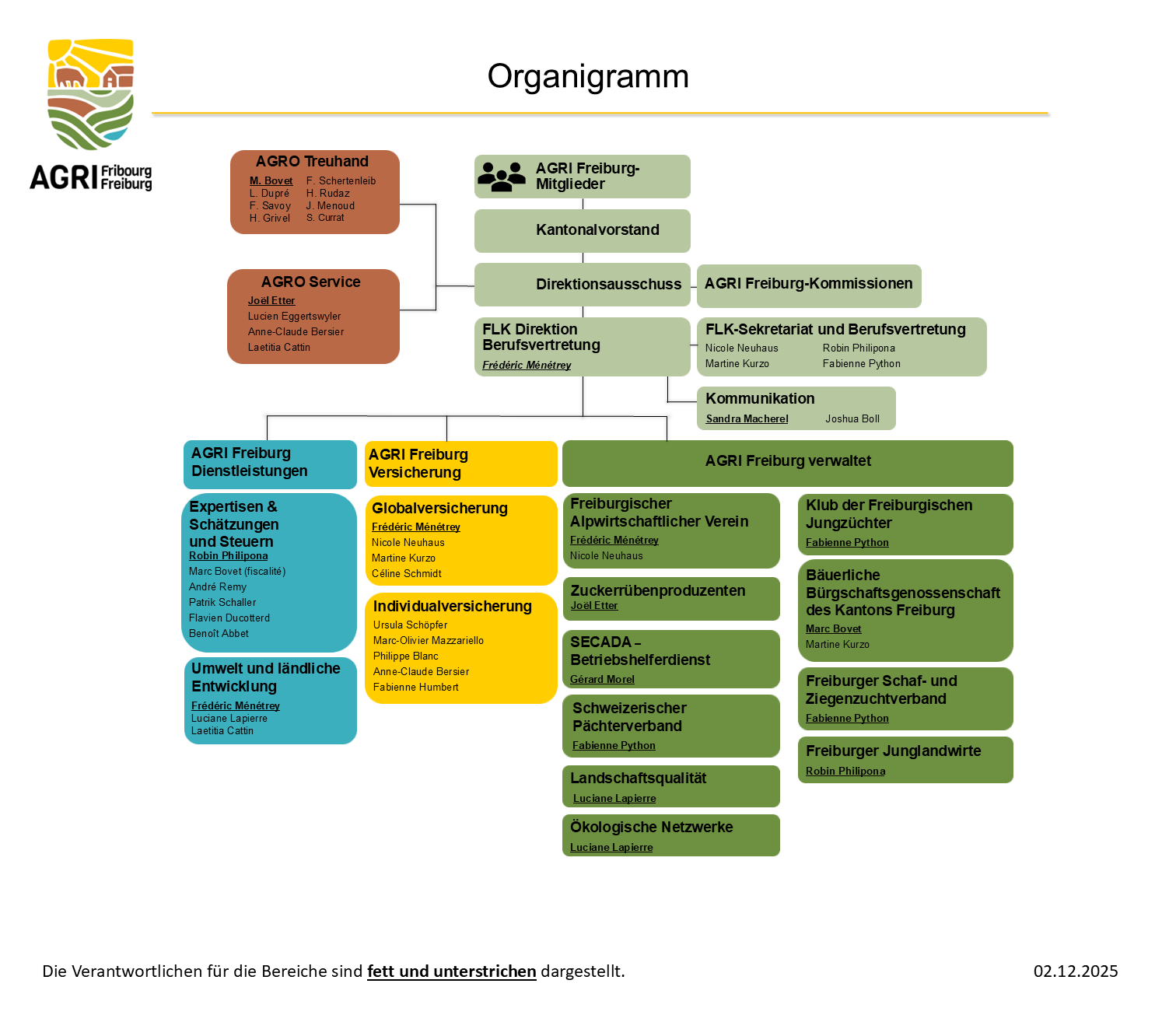 Um seine unterschiedlichen Aufgaben zu erfüllen, bevollmächtigt der AGRI Freiburg die Freiburgische Landwirtschaftskammer (FLK). Diese führt sämtliche Verwaltungsarbeiten des AGRI Freiburg aus.