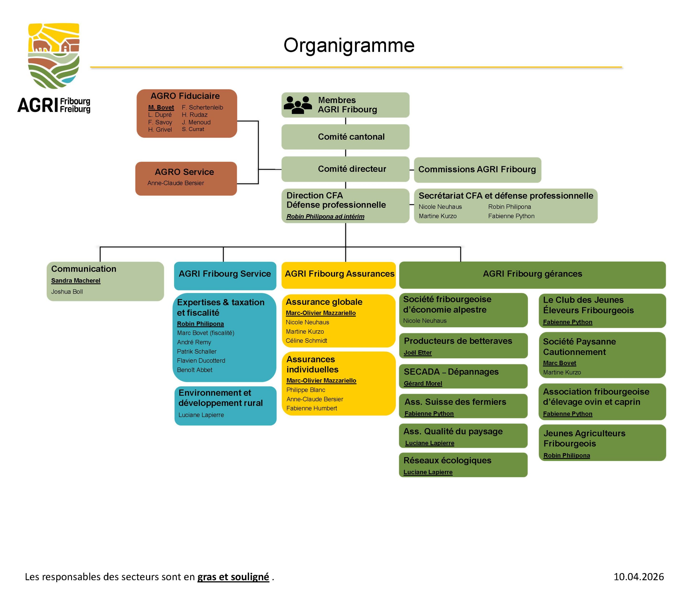 Pour accomplir ses différents travaux, AGRI Fribourg mandate la Chambre fribourgeoise d’agriculture (CFA) qui est son bureau permanent. Cette dernière s’occupe de la gestion de l'AGRI Fribourg.