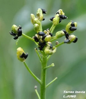 Le méligèthe du colza est un insecte ravageur. Ce coléoptère noir, mesurant environ 2mm, perfore les boutons floraux pour se nourrir du pollen du colza. Il cause de gros dégâts au printemps, lorsque la floraison est ralentie par le froid. Des mesures préventives, telles que l’utilisation de sortes précoces ou vigoureuses, peuvent être prises mais elles ne suffisent pas à éviter les ravages. Un insecticide peut être appliqué si le seuil de six méligèthes par plante est atteint mais la plupart des substances actives permettant de protéger les cultures ont été interdites et les dernières substances autorisées sont inefficaces.